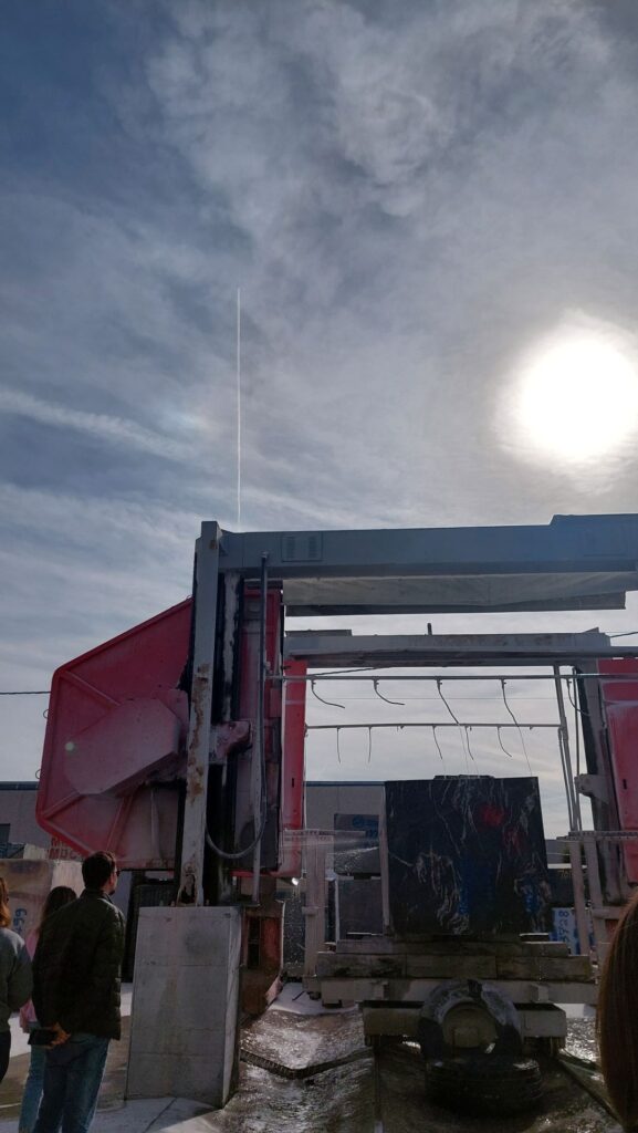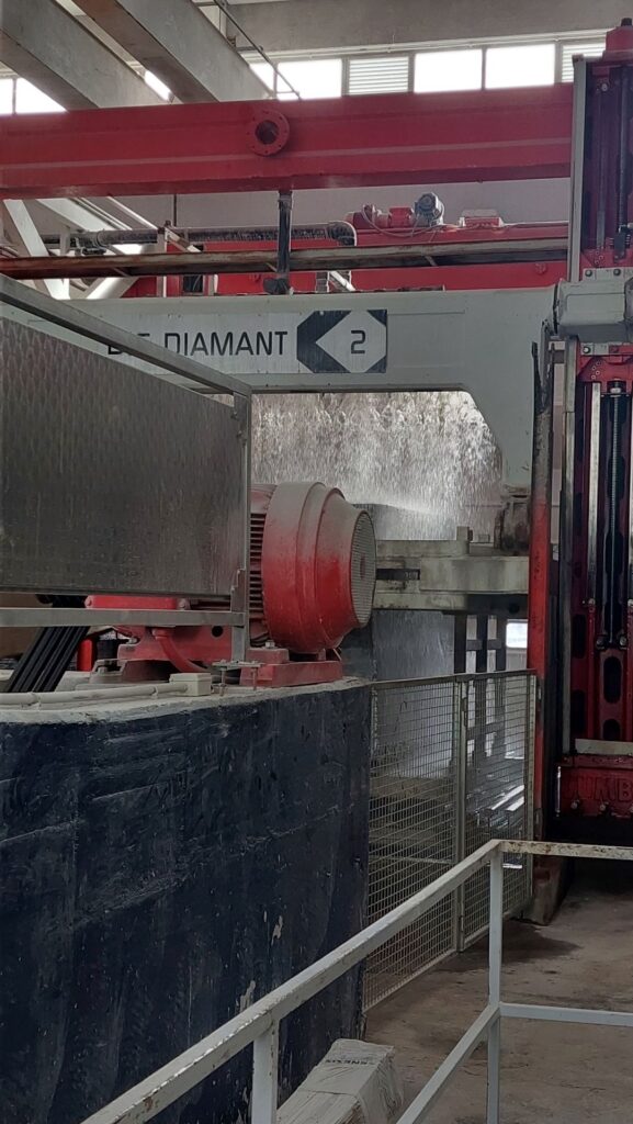 Tutaj ogromne dźwigi i profesjonalne maszyny tną blok na plastry zwane slabami. Cięcie odbywa się za pomocą lin z diamentowych i wody do ich chłodzenia. Takie maszyny to traki. Każdy z nich ma ok 55 lin diamentowych. Trwa zwykle ok 4-12 godzin. Otrzymujemy surowe płyty (slaby) o konkretnej grubości. Zwykle od 2 do 6cm.
