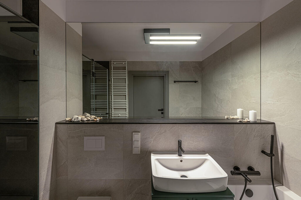 Łazienka w kamiennych odcieniach szarości to miejsce wyciszenia. Ogromne lustro powiększa przestrzeń, a połączenie toalety z pralnią pokazuje, że funkcjonalność może iść w parze z estetyką. Dzięki temu apartament staje się przykładem, jak architekt wnętrz potrafi stworzyć wnętrze dopasowane do rytmu dnia – od poranka aż po wieczór.