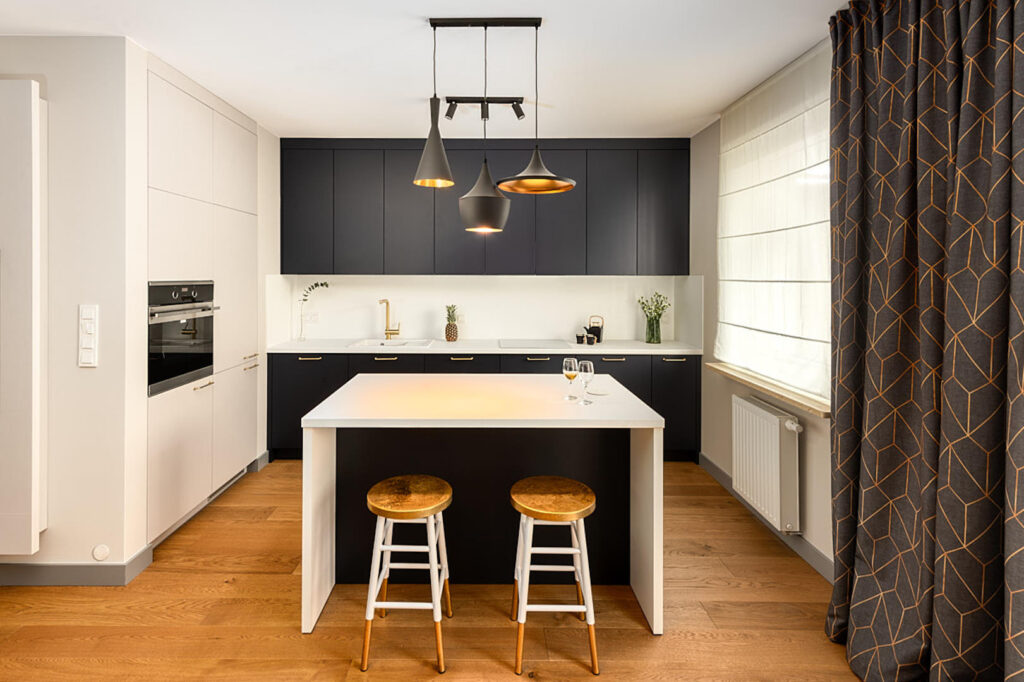 Kuchnia z granatową wyspą to serce apartamentu. Drewniana podłoga daje ciepło pod stopami, a złote uchwyty oraz stylowe stołki barowe dodają elegancji. Co więcej, to miejsce, gdzie poranna kawa smakuje najlepiej, a przestrzeń sprzyja rozmowom i spotkaniom. Takie rozwiązania pokazują, że jako architekt wnętrz potrafię połączyć nowoczesność z codziennym komfortem.