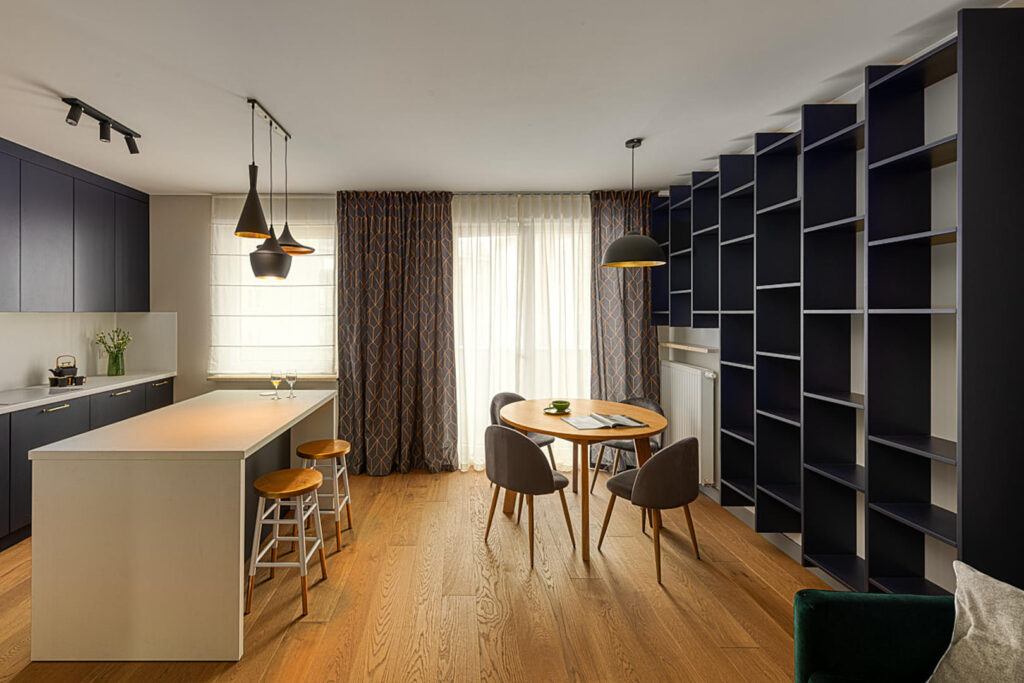 Salon z wygodną sofą w kolorze butelkowej zieleni i regałem pełnym książek to idealna przestrzeń na odpoczynek. Jednocześnie zasłony subtelnie łączą kuchnię z salonem, tworząc spójną całość. To wnętrze inspiruje zarówno do pracy, jak i relaksu – i właśnie tak projektuję przestrzenie, które wspierają różne potrzeby mieszkańców.